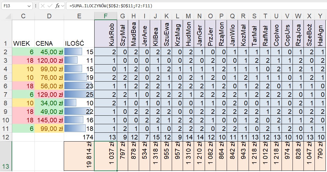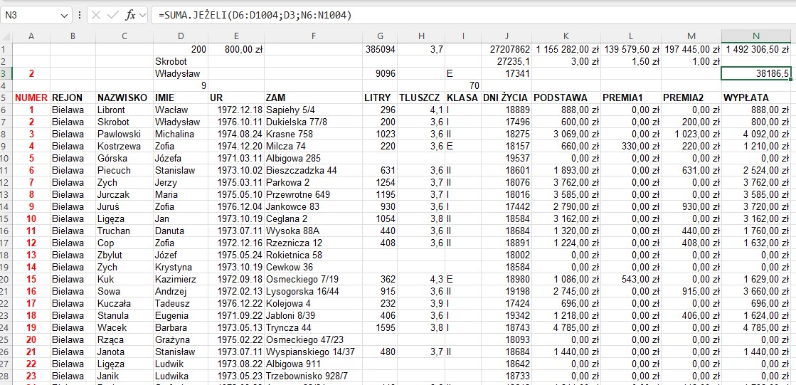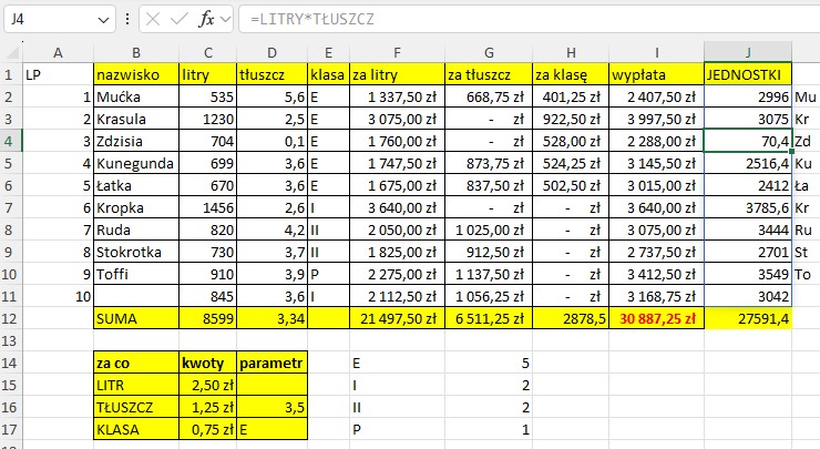 Obliczanie wypłaty w mleczarni za pomocą formuł tablicowych