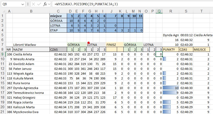 Wyścig kolarski - adresy komórek, suma, data, czas