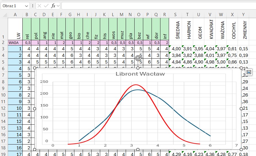 Statystyka nauczyciela - średnia arytmetyczna, geometryczna, harmoniczna, ważona, rozkład normalny Gaussa