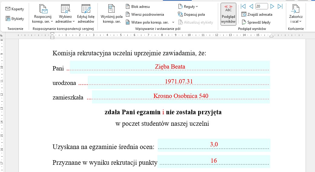 Korespondencja seryjna - pola, reguły, filtrowanie, sortowanie, scalanie